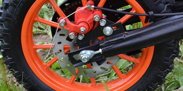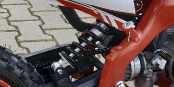 Подвески также копируют взрослые мотокроссовые мотоциклы, тут установлен моноамортизатор сзади и перевёрнутая телескопическая вилка спереди.